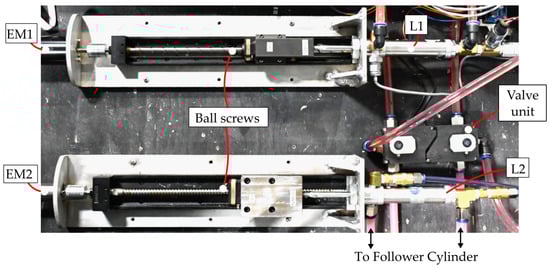 Here, we present simplified equations of motion (EoMs) describing the system behavior for all operating modes, based on the lumped-parameter approach illustrated in Figure 5 (a single-action system is illustrated for simplicity). If we consider that the fluid in the circuit is incompressible, then the combined flow of L1 and L2 is equal to the incoming flow in the follower cylinder. When all cylinders areas are equal, it leads to the following kinematic relationship between the pistons velocities and the motor velocities: