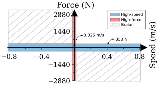 Regarding efficiency, Figure 8a,b show the results for the HF mode (a) and the HS mode (b). Joule’s losses in the motor winding are scaled with motor torque and a fixed 90% ball screw efficiency is used. The motor of the baseline solution is operating at a low inefficient velocity for the HF mode. For this mode, the two-speed solution is thus more efficient. Note that in this analysis, the scaling laws are based on a very efficient (>90% at nominal torque) and low-inertia motor series (Robodrive TQ frameless motors []). The efficiency advantage in HF mode would be higher if using less efficient motors instead. In HS mode, the energy efficiency of each solution is similar as motors operate close to their nominal velocity but the baseline solution is slightly better since bigger motors are more efficient. Note that the energy losses due to shifting between operating modes were not modeled. Finally, Figure 8c shows the efficiency for the high-power regenerative braking condition, considering no loss at the electronics and battery. The baseline solution can actively regenerate most of the mechanical energy, whereas the two-speed solution must dissipate most of the energy through the valve.