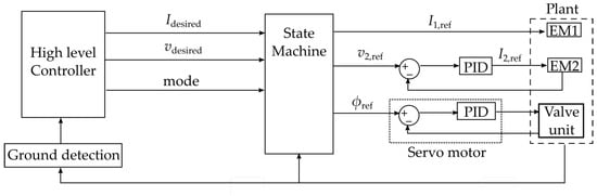 Three elements are controlled on the actuator: EM1, EM2, and the valve unit. EM1 is current controlled, which is closely related to the generated output pressure, since this line has a small reduction ratio whereas EM2 is speed controlled since it fights its own internal inertia and friction due to the large reduction ratio. The valve is controlled by imposing its position with the servo motor using its internal closed loop. Figure 13 summarizes the control scheme proposed to handle the different operating modes.