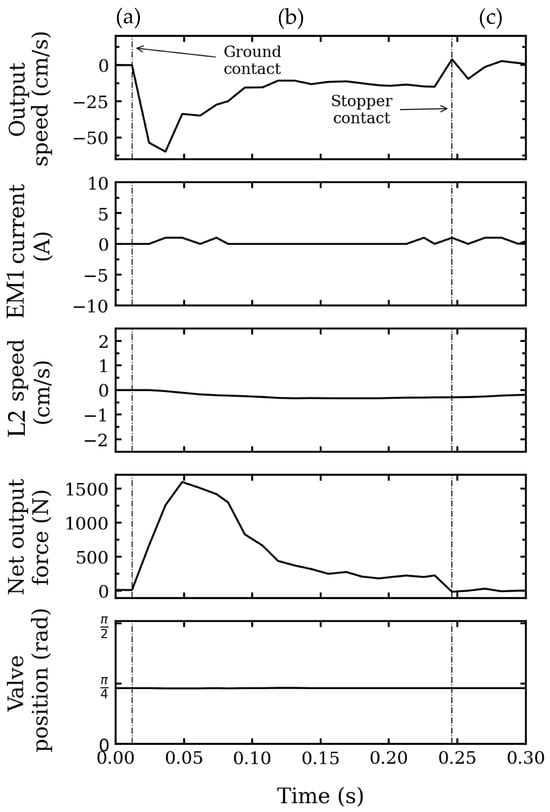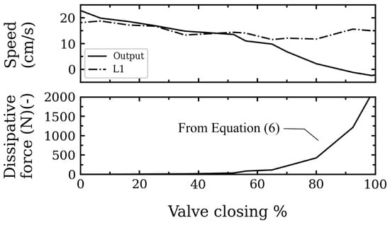 The robotic leg is held so it does not come into contact with the ground during the sequence. Between 0% and 50% valve closure, the output speed and L1 speed are directly correlated and the dissipative force is negligible. However, at 50% valve closure, L1 loses its authority: its speed stays constant while the output speed starts decreasing. This behavior can be explained by the generated dissipative force, which starts to increase exponentially, as predicted through Equation (6). Around 90% valve closure, the output speed reaches zero, meaning that from this value, the local losses are sufficiently high to block the contribution of L1. Hence, these observations suggest that EM1 should provide a continuous torque until at least 50% valve closure in order to provide initial payload support before EM2 can generate sufficient force at the output. Finally, between 90% and 100%, the output speed becomes negative, which can cause oscillations.