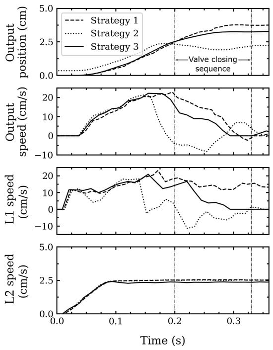 Each sequence starts in HS mode, where both L1 and L2 contribute to the output speed. Then, at 0.2 s, the valve closing sequence is initiated. Finally, at 0.33 s, the downshift is completed and the sequence ends in HF mode. Strategy 1 consists of keeping L1 speed constant during the entire valve closing sequence. Strategies 2 and 3 both consist of reducing L1 speed before the end of the valve closing sequence. However, the former uses a speed command while the latter uses a current command. Looking at the output speed, strategy 1 causes slight negative value at the end of the closing sequence. As for strategy 2, the output speed fluctuates, which translates into worse performance. Finally, strategy 3 shows the best performance since the output speed slows rapidly before the end of the closing sequence. By looking at the position, it enables a smooth downshift in less distance and without oscillations. The switching conditions are detailed in Figure 16.