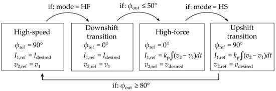 Here, since the two valves move simultaneously for all transitions, only one variable is shown for simplicity. A high-level controller specifies the mode and a reference (current in HS and velocity in HF) to a state machine. For demonstrating the capabilities of the actuator, the high-level controller is a hard-coded sequence of motion, with the exception of the downshift transition that is triggered by a ground contact detection using a combination of conditions on the knee joint encoder signal and the pressure signal in the follower cylinder.