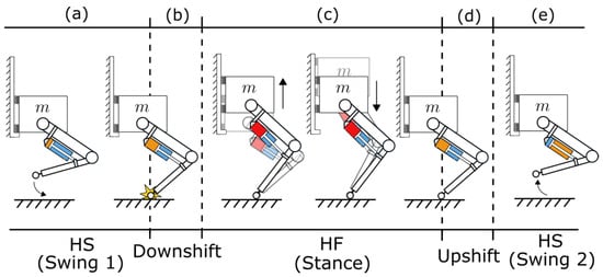 Figure 17 illustrates a test sequence analogous to a complete gait cycle: starting from rest, the leg first swings at high-speed in HS mode (a) then the foot hits the ground at high speed. The actuator detects this impact and downshifts in HF mode by closing the valves (b). Then, the leg moves up then down, lifting a  payload (c). Finally, valves are opened (d) to allow the leg to be retracted quickly using the HS mode (e). Control signals from the experiments are shown at Figure 18. Note that the net output force signal (at output cylinder) is derived from the localized pressure sensor.