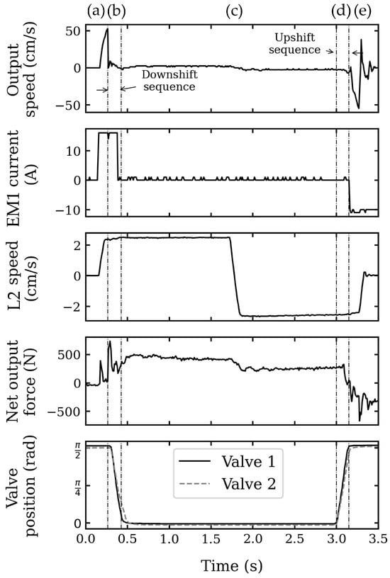 Results for the downshift and upshift transition test under load. The labels (a) to (e) are described in the text.