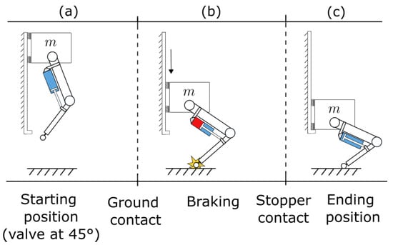 Here, it is demonstrated that the valve itself can be used to create large braking forces (in quadrants II and IV; see Figure 12) during HS mode. Figure 19 shows the motion sequence analogous to a landing. Starting 0.25 m above ground with valves halfway closed (constant 45° position) (a), the robotic leg is dropped. Upon ground contact, energy is dissipated by the valves generating high braking force (b). Then, the carriage reaches the stopper and the systems comes at rest (c). Figure 20 shows that a braking force over 1500 N was generated at a high velocity during HS mode by throttling the ball valve, using the dissipative force  shown in Equation (3). The robot is dropped with a total payload of 17 kg, including leg mass. The peak braking power here is 960 W, which is largely over the maximal power of HS and HF modes. Using  and Equation (6), it would be possible to dissipate even more energy by throttling the valve dynamically.
