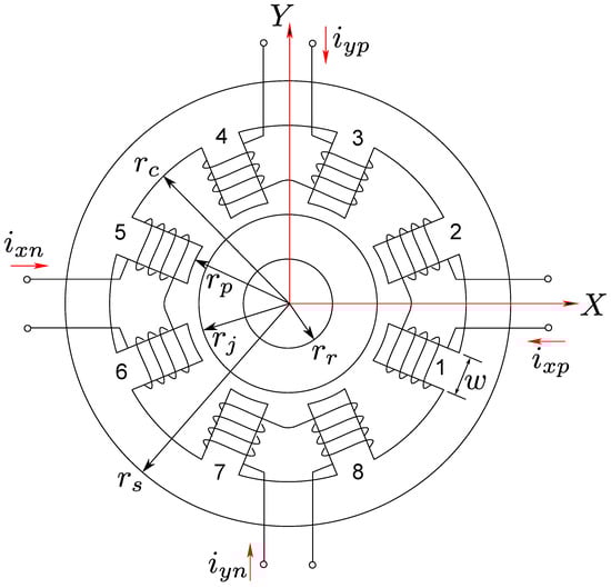 where and N are the reluctance and coil turn matrices, respectively. For the eight-pole symmetric bearing shown in Figure 1, these matrices are given in (A1) and (A2) in Appendix A. The coil current vector is