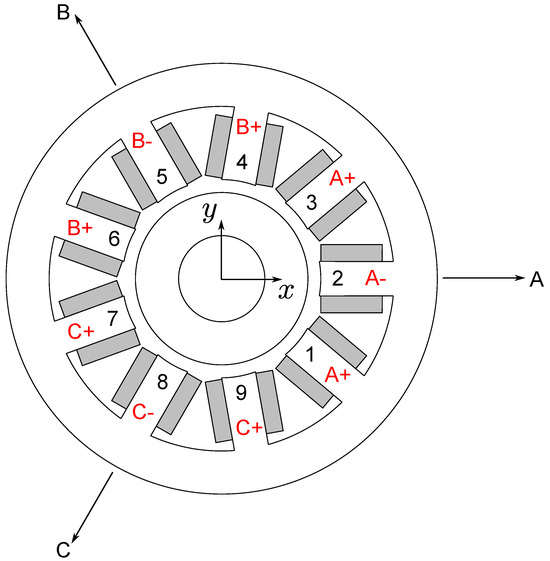 Table 2 lists the design cases. The six-pole case has a horseshoe configuration; therefore, is equal to one. The nine-pole case has a winding configuration as shown in Figure 2.