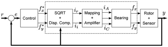 Block diagram of the linear control for active magnetic bearings. All signals are scalar quantities.
