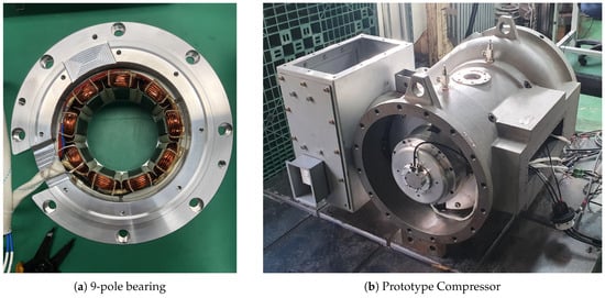 To implement and validate the logic of unbiased control, a test rig is set up. Nine-pole radial bearings with a load capacity of 1120 N and a size equivalent to the reference bearing of Table 1 are designed and constructed as shown in Figure 6a. The prototype compressor shown in Figure 6b is equipped with two nine-pole radial bearings and one thrust bearing.
