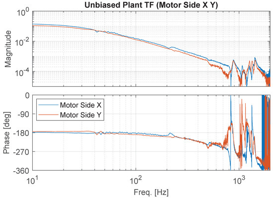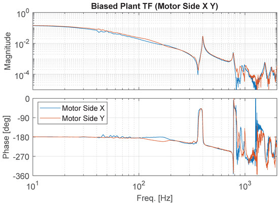 Biased compressor plant transfer functions (X and Y axis of motor-side bearing), which are measured through sinesweep tests.