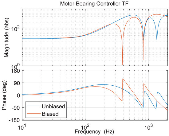 Bode plots of both biased and unbiased controller for motor bearing. Note that the proportional gain of unbiased control is adjusted according to (29) so that it can be compared with the biased control.