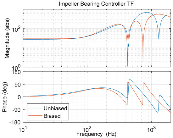 Bode plots of both biased and unbiased controller for impeller bearing.