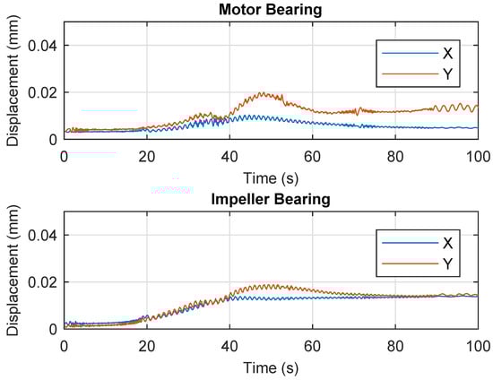 Figure 16 and Figure 17 show the vibrations at the bearing locations while spinning the rotor up to 10,000 rpm. In both cases, the peak vibrations are less than 0.02 mm. ISO 14839-2 [21] states that the vibration must be less than 30% of the allowable clearances, which is 0.06 mm for the two test rigs. Therefore, the unbiased control scheme used in this paper limits the vibration as much as the biased counterpart, and also satisfies the performance requirements.
