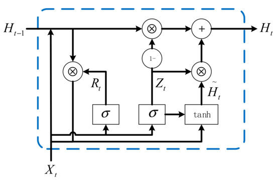 The GRU network mainly consists of a reset gate and an update gate, as shown in Figure 1. The key function of the reset gate is as follows: when it is near 1, the candidate hidden state information results from the multilayer perceptron consisting of both the input and the preceding state information. However, when the reset gate is near 0, the candidate hidden state is derived solely from the multilayer perceptron composed of the current inputs. The central role of the update gate is that when it is near 1, the model tends to retain only the previous state, disregarding the information from the inputs. Conversely, when the update gate is close to 0, the new hidden state tends to match the candidate hidden state.