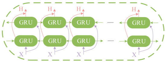 In this paper, we consider using Bi-GRU as the feature extractor for the model. Bi-GRU consists of two GRUs, forward and reverse, which can extract the feature information of the past and the future at the same time. The output of the Bi-GRU is determined by the hidden states of the two GRUs. The structure of the Bi-GRU is shown in Figure 2. Similarly, we can derive the output of reverse GRU as and finally, we can derive the output of Bi-GRU as .
