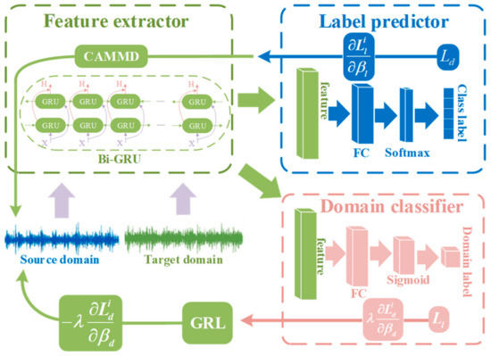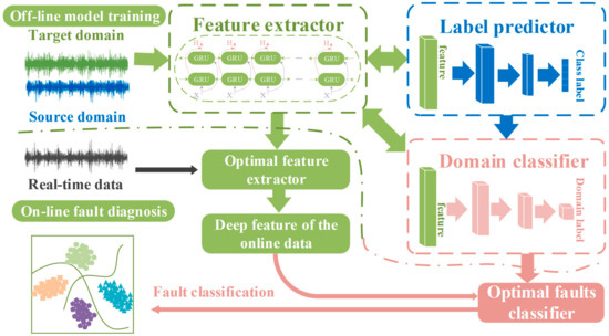 The BRDATL-based fault diagnosis proposed in this paper is mainly divided into two parts: offline training of the diagnostic model and online state detection. As shown in Figure 4, in the off-line part of the model training, the feature extractor Bi-GRU is first applied to the input signal feature extraction , to obtain the depth of the signal feature, the feature is passed into the label predictor domain classifier. The domain classifier is responsible for creating an adversarial environment to determine whether the signal comes from the source domain or the target domain , and this process is conducted through CAMMD. Then, the parameters of the feature extractor are updated through the gradient reverse layer GRL, so that the domain classifier cannot distinguish whether the parameters extracted by the feature extractor are from the source domain or the target domain. At the same time, the domain classifier is trained so that it can judge which domain the feature comes from and obtain the best feature extractor in this adversarial environment. The label predictor finally predicts the type of fault through , updates the hyperparameters through cross-validation with the feature extractor, and finally becomes a more accurate fault classifier. Next is the online fault diagnosis process, where the real-time data are passed to the optimal fault classifier after the optimal feature extractor extracts the deep features, and the fault results are derived from the fault classifier in real-time.
