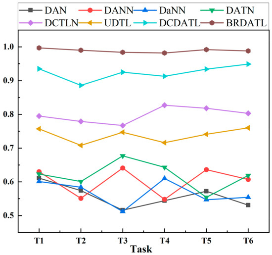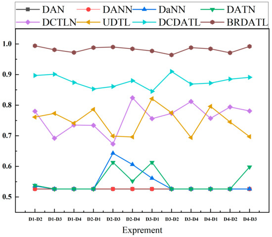 Based on the above experiments based on the CWRU bearing data set, in order to further verify the accuracy of the BRDATL model proposed in this paper, this section will conduct experiments on the modified XJTU-SY data set. After completing all the experiments, the results are shown in Table 8 and Figure 14. Because D5 lacks inner ring fault data and D7 lacks cage fault data, the target faults identified by each task are different.