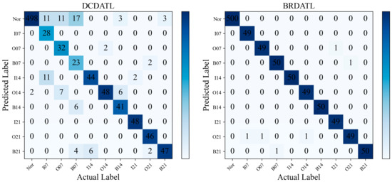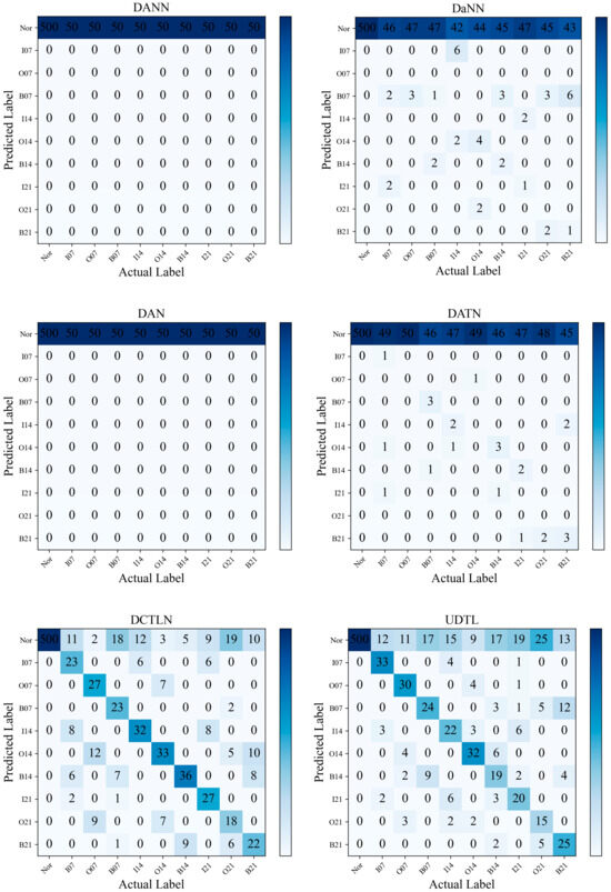 When D1 is the source domain and D2 is the target domain for the experiment based on the CWRU bearing dataset, the prediction accuracy of each model is shown in the confusion matrix in Figure 8. It can be seen that on DAN, DANN, DATN, and DaNN, almost all faults are recognized as normal states, which may be due to the “labeling bias” of the training data caused by the data imbalance, which results in the decision boundary of the labeled classifier not traversing the feature space of the secondary classes. UDTL and DATLN have better recognition accuracy than the above four methods, but their performance could be better for fault diagnosis. Whereas DCDATL has better recognition in the latter six classes, it has poor recognition with a fault depth of 0.007, whereas the BRDATL proposed in this paper recognizes almost all faults correctly.