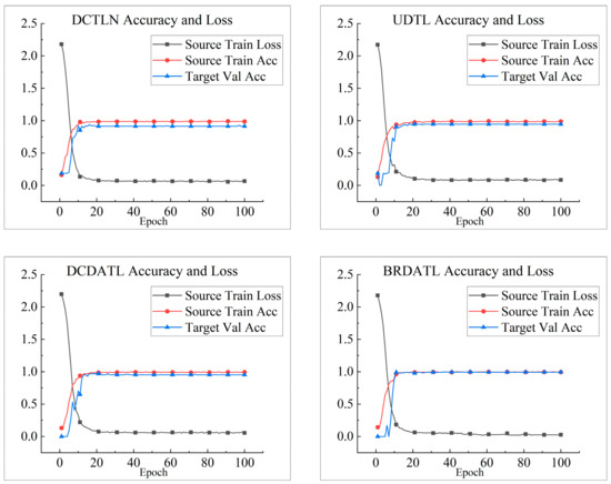 Figure 9 illustrates the training loss, training accuracy, and validation accuracy iterations of each model on tasks D1-D2. The four models DAN, DANN, DaNN, and DATN fluctuate a lot during training, and the training loss stays above 1, and the training accuracy and validation accuracy are around 50%. For the remaining four models, the models almost reach a stable convergence state when trained about 20 times, and the model validation accuracy of BRDATL can reach 99%. At the same time, as the model converges, the loss function begins to converge to 0. From the demonstrated results in Figure 8, it can be seen that although the three models UDTL, DATLN, and DCDATL have some diagnostic effect in the case of data imbalance, there is still a particular gap compared to the BRDATL proposed in this paper, which has a positive performance in data imbalance fault diagnosis.