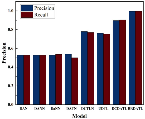 As shown in Table 5 and Figure 10, DAN and DANN perform poorly in the F1 score due to the imbalance between the number of samples of different categories in the training dataset, i.e., the number of samples of the normal state is much greater than that of the other categories, thus leading to a poor F1 score, and DaNN and DATN perform poorly even though they recognize some of the states of some of the categories. The three parameters show that DCTLN and UDTL perform poorly on the F1 score, although both are above 75% in precision and recall. Moreover, although DCDATL performs superiorly to the above six models in the three evaluation indexes, there is still a gap with the BRDATL proposed in this paper.