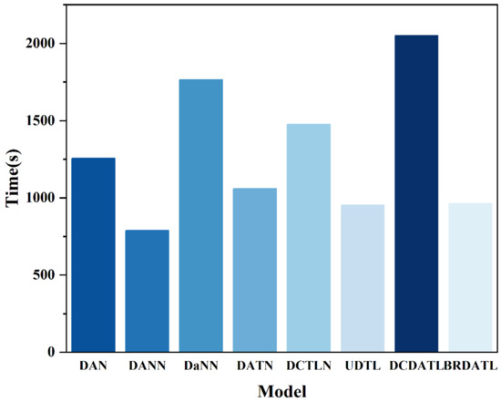 The training elapsed time as well as the core structure of the BRDATL proposed in this paper and other comparative experiments are shown in Table 6 and Figure 11. It can be seen that although the BRDATL has positive results in terms of diagnostic accuracy, the training elapsed time is only the third least achieved due to the incorporation of the Bi-GRU for feature extraction.