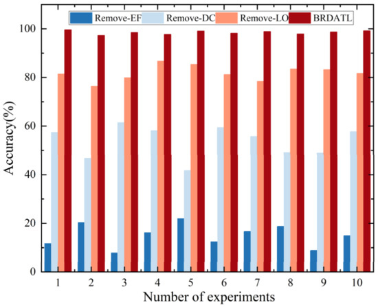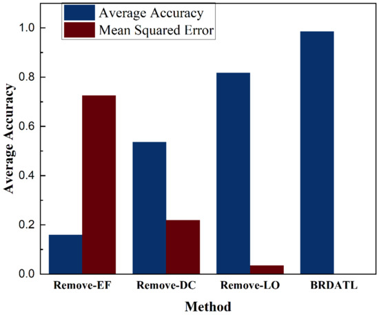 The results of the ablation experiments are shown in Figure 12. All the models were repeated 10 times, respectively, and the average accuracy domain mean square error of each module is shown in Table 7 and Figure 13. From the results, it can be seen that, compared to BRDATL, the removal of the other three modules results in a significant degradation of the model’s performance. Remove-EF and Remove-DC exhibit catastrophic performance, especially with diagnostic accuracies dropping to 15.92% and 53.61% and mean-square errors of 72.59% and 21.9%, respectively, where the mean square error quantifies the divergence between the observed and actual values; hence, a smaller value is preferable. Moreover, although Remove-LO performs well in accuracy, it cannot meet the needs of fault diagnosis. From the above, experimental removal of the feature extractor causes the model to be completely unable to learn effective feature representations, which leads to drastic performance degradation.