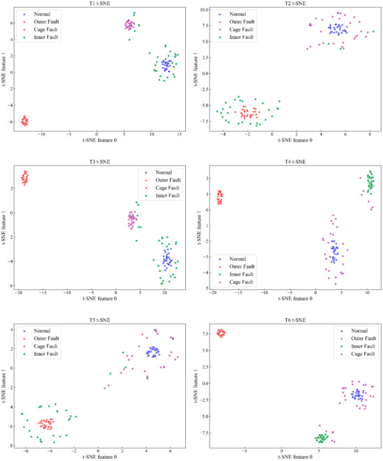 In addition, the t-SNE method can effectively map the high-order feature dimension to the low-order feature dimension to realize the visualization of features. Therefore, the performance of the BRDATL model on this data set can be clearly observed through the t-SNE diagram. As shown in Figure 15, it can be clearly seen that when BRDATL is tested in 6 tasks, in T1 and T3 tasks, due to the lack of inner ring fault data in D5, the recognition of inner ring fault samples is abnormal. In T4 and T6 tasks, due to the lack of cage fault data in D7, the cage fault identification is wrong. Finally, in the T2 and T5 tasks, due to the lack of samples of D5 and D7, the cage fault and inner ring fault are identified as abnormal. However, in the case of complete data, the boundary of the t-SNE diagram is obvious, and the type of fault can be well judged.