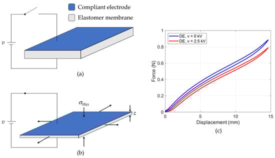 Operating principle of a DEA, deactivated state (a), activated state (b), and example of force-displacement characteristics for different applied voltages (c).