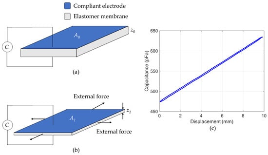 Other than working as an actuator, a DE membrane can also be used in sensing applications. With respect to the DE sensor (DES) layouts shown in Figure 2a,b, we can express the electrical capacitance via the usual parallel-plate capacitor equation:
