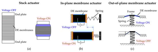 The high flexibility of DEAs makes it possible to generate a variety of layouts and actuation modes [83]. It can be noted that the Maxwell stress principle shown in Figure 1 can be exploited to generate two different actuation modes, i.e., thickness contraction and membrane expansion. Those two modes are exploited to develop different types of DEAs.