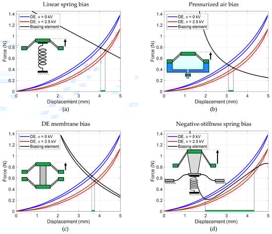 In order to generate a meaningful actuation stroke, a membrane DEA is usually combined with a mechanical biasing system which provides a pre-load force. It is remarked that the role of such a biasing system is fundamental in determining the performance of the actuator [99], and can lead to an increase in stroke up to one order of magnitude given the same DE membrane layout and applied voltage [86]. To understand why, we notice that at equilibrium the force of the DE membrane and the one of the biasing system must be equal. Graphically, such equilibrium condition can be obtained by plotting the biasing system force-displacement curve on top of the DE membrane characteristics, and checking for the corresponding intersection points. In particular, the intersections between the biasing curve and the low/high voltage DE curve correspond to the equilibrium position when the DE is deactivated/activated; thus, their inspection allows to readily estimate the stroke. Figure 4 provides several examples of commonly adopted biasing systems, together with the corresponding force-displacement curves for prediction of the stroke. As it can be seen, conventional biasing solutions, such as hanging masses [88,100], linear springs [101,102], pressurized air [103,104], or a second DE membrane [105,106] leads to a relatively small actuation stroke. In contrast, the use of negative-stiffness types of springs results in a significantly larger amount of stroke, since the resulting change in slope allows the biasing system curve to fit between the two DEA characteristics (note that the slope of the biasing curve appears as positive even though the stiffness is negative, since we are plotting the bias curve with respect to the DE deformation, not the biasing one). In the literature, this type of negative-stiffness biasing has been achieved in several ways, e.g., via bi-stable beams [91,99], attracting permanent magnets [107], compliant [92] as well as spring-based mechanisms [108], or buckling polymeric domes [109].