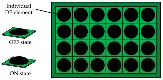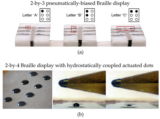 Examples of two-dimensional DEA arrays for refreshable Braille displays: (a) 2-by-3 pneumatically biased Braille display [154], reproduced with permission from John Wiley and Sons, copyright 2020; (b) 2-by-4 Braille display with hydrostatically coupled actuated dots [155], reproduced with permission from Elsevier, copyright 2018.
