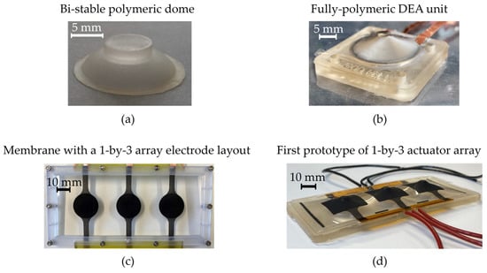 Fully polymeric DEA array developed in the context of the DECMAS project: (a) Bi-stable polymeric dome; (b) Fully polymeric DEA unit; (c) Silicone membrane with a screen-printed 1-by-3 electrode layout; (d) First prototype of 1-by-3 actuator array.