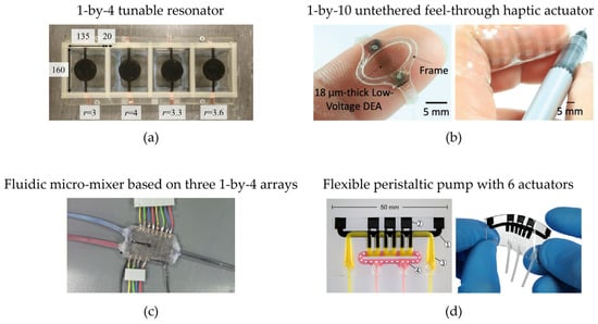 Examples 1D DE arrays: (a) 1-by-4 tunable resonator [128]; (b) 1-by-10 untethered fee-through haptic actuator [129], reproduced with permission from John Wiley and Sons, copyright 2020; (c) Fluidic micro-mixer based on three 1-by-4 arrays [130], reproduced with permission from IOP Publishing Ltd., copyright 2018; (d) Flexible peristaltic pump with 6 integrated actuators [131].