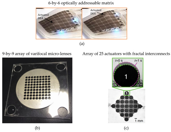 Examples of two-dimensional DEA arrays operating out of plane: (a) 6-by-6 optically addressable matrix [141], reproduced with permission from Royal Society of Chemistry, copyright 2022; (b) 9-by-9 array of varifocal micro-lenses [142]; (c) Array of distributed electrodes with fractal interconnects architecture [143], reproduced with permission from IOP Publishing Ltd., copyright 2021.