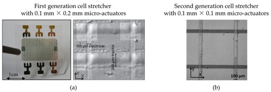 Examples of two-dimensional DEA arrays operating in plane: (a) First generation cell stretcher based on a 8-by-9 array with of 0.1 mm × 0.2 mm micro-actuators [146], reproduced with permission from IOP Publishing Ltd., copyright 2012; (b) Second generation cell stretcher based on 0.1 mm × 0.2 mm micro-actuators [147], reproduced with permission from Elsevier, copyright 2012.