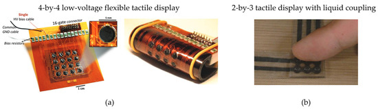 Examples of two-dimensional DEA arrays for tactile displays: (a) 4-by-4 flexible array of low-voltage actuators [111], reproduced with permission from John Wiley and Sons, copyright 2017; (b) 2-by-3 tactile display based on liquid coupling [150], reproduced with permission from Elsevier, copyright 2014.