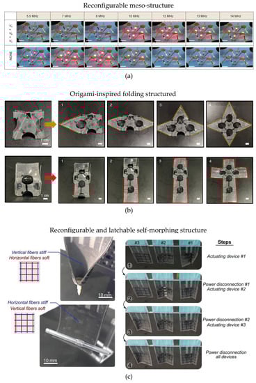 Examples of three-dimensional DEA reconfigurable structures: (a) 3D reconfigurable meso-structure [156]; (b) 3D origami-inspired folding actuator [157]; (c) Reconfigurable and latchable shape-morphing structure [158], reproduced with permission from John Wiley and Sons, copyright 2020.