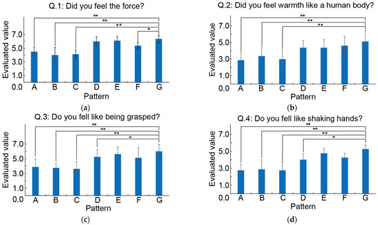 - The participants were asked to move their hands for 5 s to simulate a handshake. Subsequently, the participants answered survey questions for 30 s. The questions are summarized in Table 3. In addition to the question concerning whether they felt the sensation of a handshake, three additional questions were prepared in this study. The first was whether they felt the force from the actuator. The second was whether they felt warmth from the heated actuator. The third was whether they felt the sensation of being grasped. The participants were asked to respond using a 7-point scale (from 1: Could not feel at all to 7: Feeling was strong). Because the surface temperature of the palm of the hand was about 33 °C, the pouch actuator did not shrink for about 30 s after the heating stopped.
