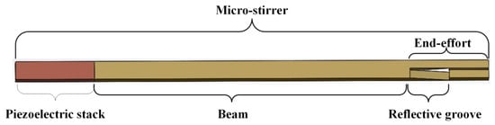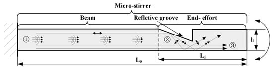A wire-type micro-stirrer is hereby proposed, which can transmit longitudinal elastic waves from an external transducer to the stirrer tip and convert the longitudinal vibration into transverse vibration just at the end-effort []. The longitudinal elastic wave excited by the transducer is transmitted through the long distance of the beam and reaches the groove. Then, part of the longitudinal elastic wave impinges on the slant surface of the groove and changes direction based on Snell’s law, which induces transverse vibration at the end-effort only (Figure 2). In this design, the transducer is placed outside of the body without size restriction so that enough driven force can be supplied. However, in this design, the desired vibration mode can be achieved only for a given proportion of end-effort length and the entire stirrer length (Equation (1)) []. Therefore, this design cannot provide a stable vibration mode, and the micro-stirrer size cannot be adjusted discretionarily for applications in different blood vessels.