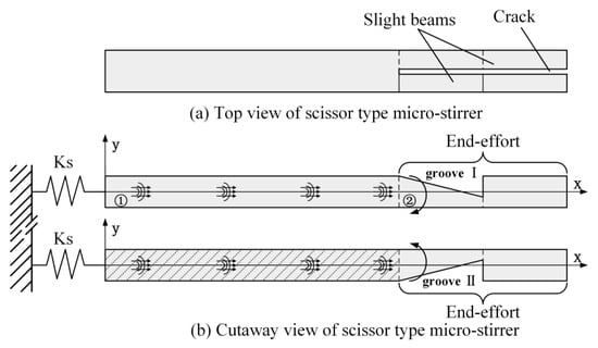 Theoretical model of scissor-type micro-stirrer ① Longitudinal driven force, ② Bending moment at the reflective groove.