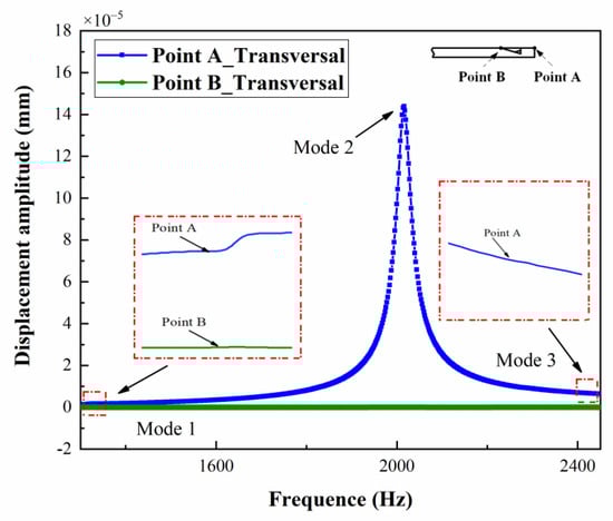Harmonic analysis was performed to analyze the vibrational state in detail. Figure 6 shows the transversal displacements of the stirrer tip and beam driven by sweep frequency ranging from 1300 Hz to 2450 Hz with a voltage of 20 V added at the PZT. A maximum vertical deflection with a value of 1.44 × 10−4 mm is excited at the tip (point A) under the response frequency of 2015.4 Hz, and the deflection on the beam (point B) is negligible. In contrast with the scissor-type mode, the other two vibration modes excite small vertical deflections at all resonant frequencies, further demonstrating the design effectiveness of the scissor-type micro-stirrer.