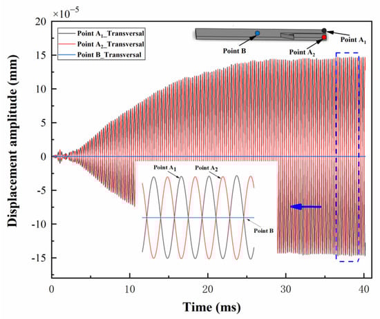 Furthermore, a transient analysis was performed by adding a sinusoidal voltage of 20 V at the resonant frequency of 2015.4 Hz. The actual vibration of the micro-stirrer, as well as the deflection stability of the model, were thus evaluated. The transversal displacement of the two tips (point A1 and A2) and one beam point (point B) are simulated from 0–40 ms with 0.01 ms intervals. As shown in Figure 7, the curves begin with a small deflection which indicates the delay time of the oscillation start. A larger deflection is excited successfully with time, with a maximal amplitude of 1.44 × 10−4 mm, which coincides with the results of the harmonic analysis. The phase positions of these two tips (point A1 and A2) are opposite, which confirms the stability of the scissor-type vibration mode. Meanwhile, the transversal displacement of the beam is almost zero, which further confirms that longitudinal vibrations are effectively converted into tip deflection concentrated at the end-effort.