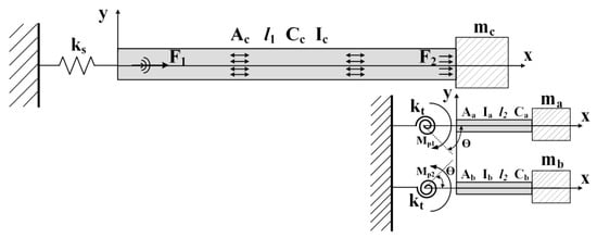 where Aa, Ab and Ac are the cross-section areas of the groove and beam, respectively, ρ is the mass density, E is Young’s elastic modulus, u is the longitudinal vibrational displacement of the beam, y is the transversal vibrational displacement of the end-effort, δ is the Dirac coefficient, F1 is the input driven force at x = 0, Mp is the input torque at the torsional spring, θ is the rotational angle of the torsional spring, Ia, Ib and Ic are the inertia moment of the groove and beam, respectively, l = l1 + l2, where l1 is the length of the beam and l2 is the length of groove and Ca, Cb and Cc are the damping coefficients.