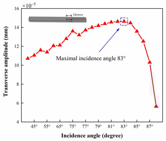 Figure 11 shows that the highest energy reflection coefficient of the shear wave is obtained when the incident angles are 50° and 85°, which is the key to achieving high performance. For incident angles less than 50°, the reflection energy cannot reach the stirrer tip. In addition, in this design, some part of the energy will pass through the groove and impact with the reflective shear wave, which will lead to a complicated interference phenomenon. Considering these situations, several models with different incident angles are tested, with the other structure parameters kept the same as the above model. The transverse amplitudes with different incident angles are shown in Figure 12. The scissor-type structure design produces the highest amplitude at an incident angle of 83°, whereas the amplitude at an incident angle of 85° is much less. Therefore, in this design, the optimal incident angle is determined as 83°.