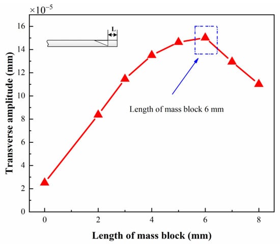 The simulated results in Figure 13 show that the highest amplitude is excited at the tip length of 6 mm. According to the simulation curve, the amplitude increases as the mass length is less than 6 mm and decreases as the mass length is bigger than 6 mm. In the above simulations, the groove length remained the same along with the mass length, which also affects the conversion efficiency. This means that the inertia mass has a great influence on the mode conversion. However, the optimal inertia mass is not a certain value, which may be changed along with the groove length.