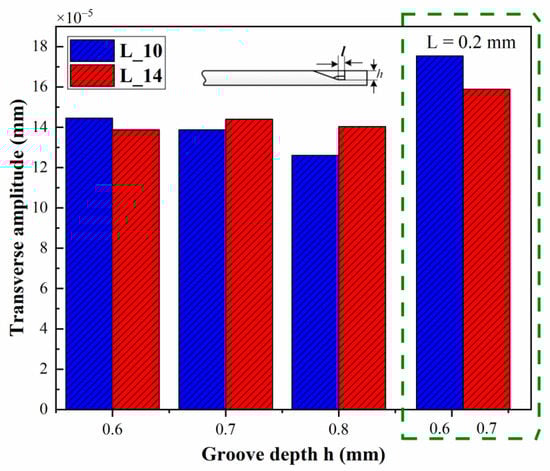 The two models with the highest amplitudes are selected and modified to further reduce stiffness and increase the amplitude. Models with groove lengths extended by 0.2 mm are tested. The simulation results showed that both models have higher amplitudes with values of 1.75 × 10−4 mm (L = 10 mm) and 1.59 × 10−4 mm (L = 14 mm). This indicates that the extended groove length greatly lowers the stiffness to increase the transversal amplitude, which is a good way to improve output performance. All the above simulated results demonstrate that the mode conversion efficiency is not determined by one parameter only, and the optimal structure parameters depend on specific situations.