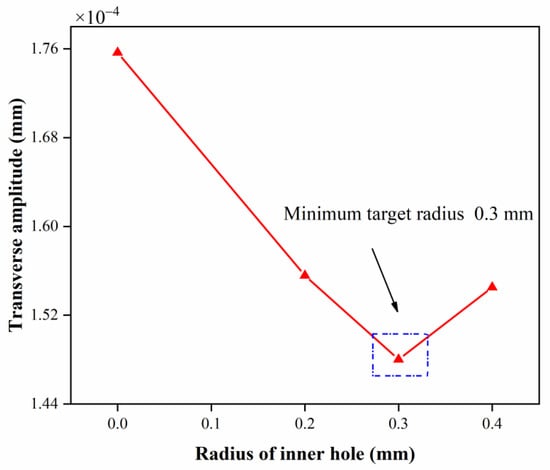 Figure 15 shows that the micro-stirrer without an inner hole has the highest mode conversion efficiency with a transversal amplitude of 1.75 × 10−4 mm. However, the relationship between the radius of the inner hole and the transverse amplitude does not decrease linearly. For a radius of 0.3 mm, the mode conversion efficiency decreases to the lowest level with a transversal amplitude of 1.48 × 10−4 mm and then starts to rise to 1.54 × 10−4 mm for a radius of 0.4 mm. Considering the overall structural dimension of the stirrer, the optimal radius with the highest transverse amplitude is a radius of 0.2 mm.