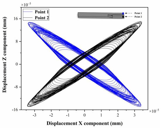 Additional evaluation of the final mode conversion efficiency with the optimal inner hole size is conducted through a transient analysis to calculate the motion trajectory of the stirrer tip. To this end, a sinusoidal voltage with an amplitude of 20 V and resonance frequency of 1750.7 Hz is added at the PZT. The stationary vibration data of the motion trajectory of both tips are recorded and plotted from 9 ms to 40 ms. Figure 16 shows that the motion trajectory of each tip is symmetrical to the x-axis, like a scissor, which coincides with the proposed design. The transverse vibration converted at the end-effort is the key to generating effective stirring and mixing of the blood clot with a thrombolytic agent. Simultaneously, as Figure 2 shows, some part of the longitudinal elastic wave passes through the groove and excites longitudinal vibration to crush the thrombus. The longitudinal and transverse amplitudes are 3.53 × 10−5 mm and 1.56 × 10−4 mm, respectively. The transverse amplitude decreased compared with the model without an inner hole, which proves that the material removal reduces the longitudinal force. Figure 16 also shows that as time passes, the vibration trajectory becomes an elliptical vibration which has both knocking and stirring functions to accelerate thrombus dissolution. Therefore, the proposed micro-stirrer can generate stable and reliable scissor-type vibration, as well as higher efficiency than single vibration for cerebral vascular interventional therapy.