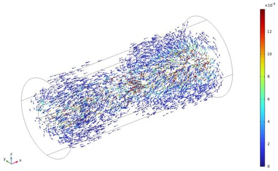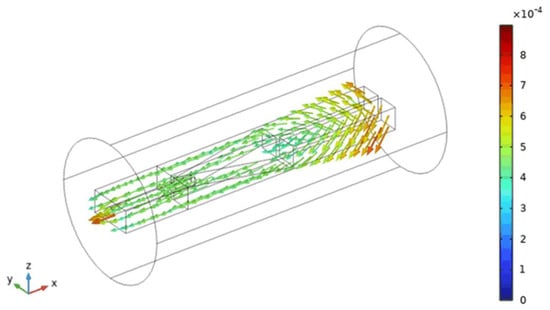Figure 17 shows the simulation results of the fluid structure interaction model. As the scissor-type vibration is stable, the flow directions of liquid on the end-effort of two beam tips are opposite, which coincides with the vibration mode. The high flow velocity concentration on the tip of the end-effort is developed because of the high transverse amplitude at tips, and the flow velocity gradually decreases with the length increase far away from the stirrer tip. Moreover, the highest flow velocity with a value of 8.97 × 10−4 m/s occurs at the exit of the inner hole due to the pressure difference between the blood vessel and the inner hole. This also demonstrates that under the scissor-type vibration mode, the maximum flow velocity at the inner hole can provide auxiliary suction force for aspirating blood clot fragments.